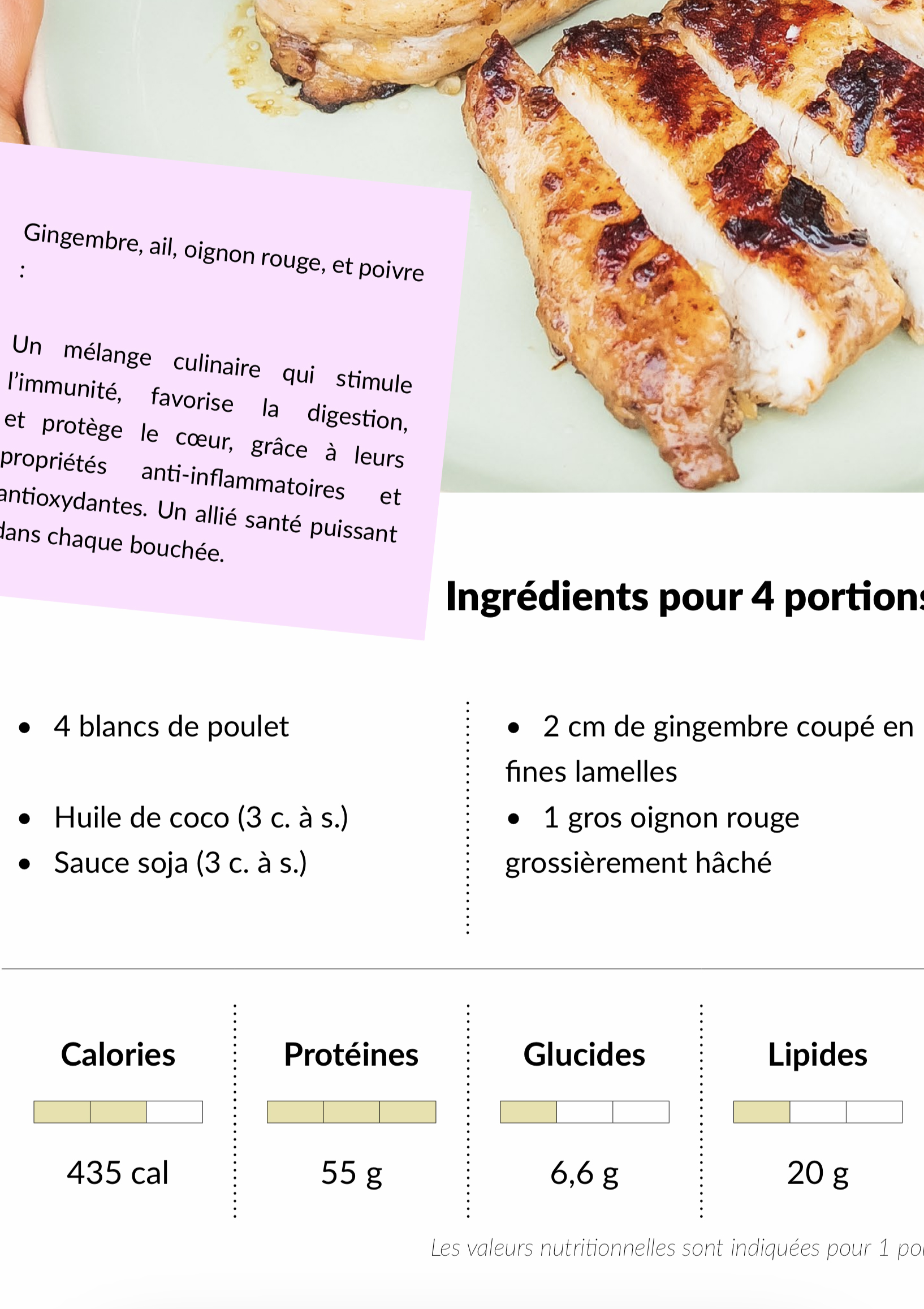 Avec votre santé et vos objectifs sportifs à l'esprit, chaque recette comprend une analyse nutritionnelle détaillée. Vous trouverez des informations sur les calories, les protéines, les glucides, les lipides, les fibres et l'index glycémique pour vous aider à suivre vos apports journaliers et à rester aligné avec vos objectifs de nutrition.