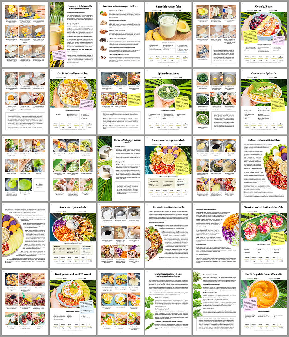 Découvrez une interface conçue pour enrichir votre expérience culinaire. Mon livre numérique dispose d'un menu cliquable intuitif, vous permettant de naviguer facilement entre les différentes recettes. Que vous soyez à la recherche d'un petit-déjeuner tonique ou d'un dîner rassasiant, un simple clic vous mènera à la page souhaitée. Interactivité et simplicité vont de pair pour vous offrir une utilisation fluide et agréable.