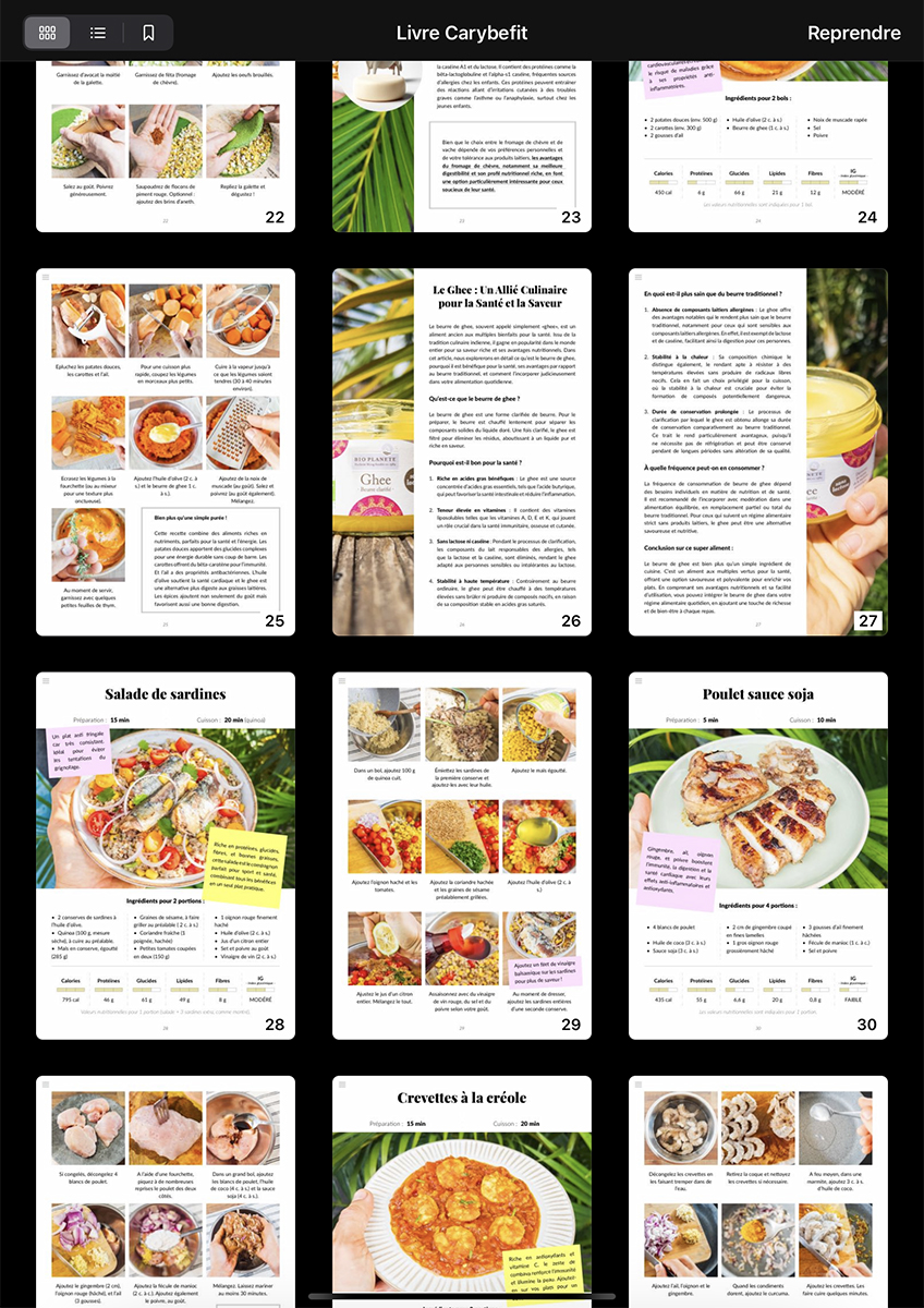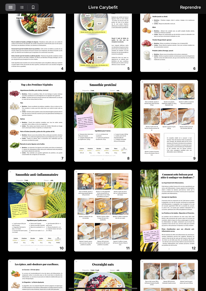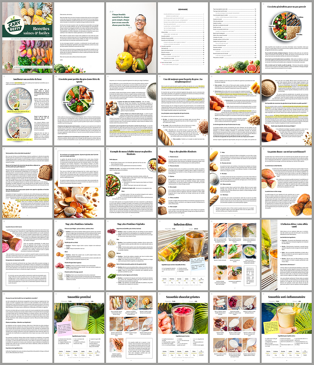 Plongez dans l'univers des Recettes Carybefit, où clarté et esthétisme se mêlent pour rendre chaque préparation accessible et agréable. Des photos alléchantes aux descriptions précises, chaque page est conçue pour faciliter votre parcours culinaire. Que vous souhaitiez concocter un smoothie protéiné, une salade fraîche ou une assiette réconfortante, vous trouverez des recettes adaptées à vos goûts et à votre mode de vie actif.