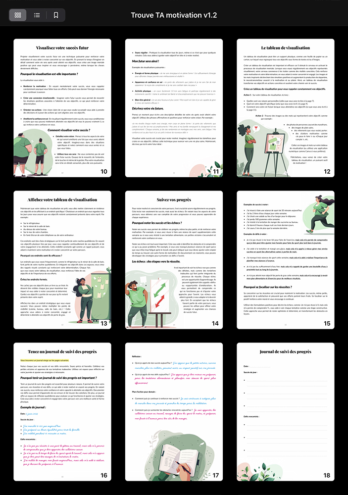 Techniques de visualisation et rappels visuels : Crée des images mentales de ton succès futur et utilise des rappels visuels stratégiques pour maintenir ton engagement quotidien.
